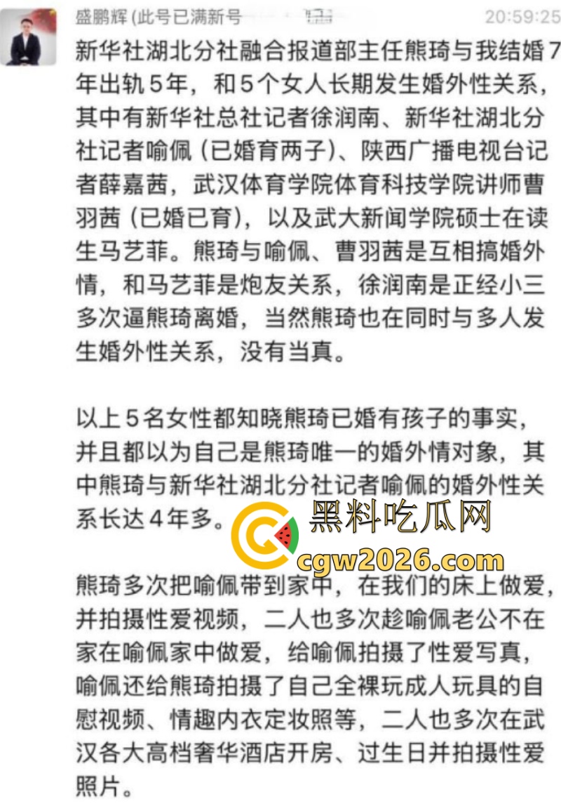该文章由全网吃瓜发布,转载请注明来源并附上原文链接: 新华社湖北分社主任 熊琦 结婚7年出轨5年 同时与5名女记者保持性关系 携带HPV高危病毒 渣到极致!