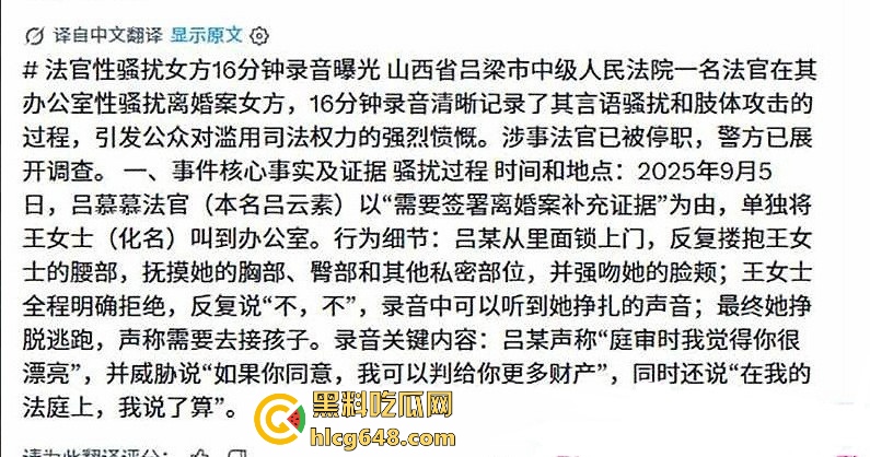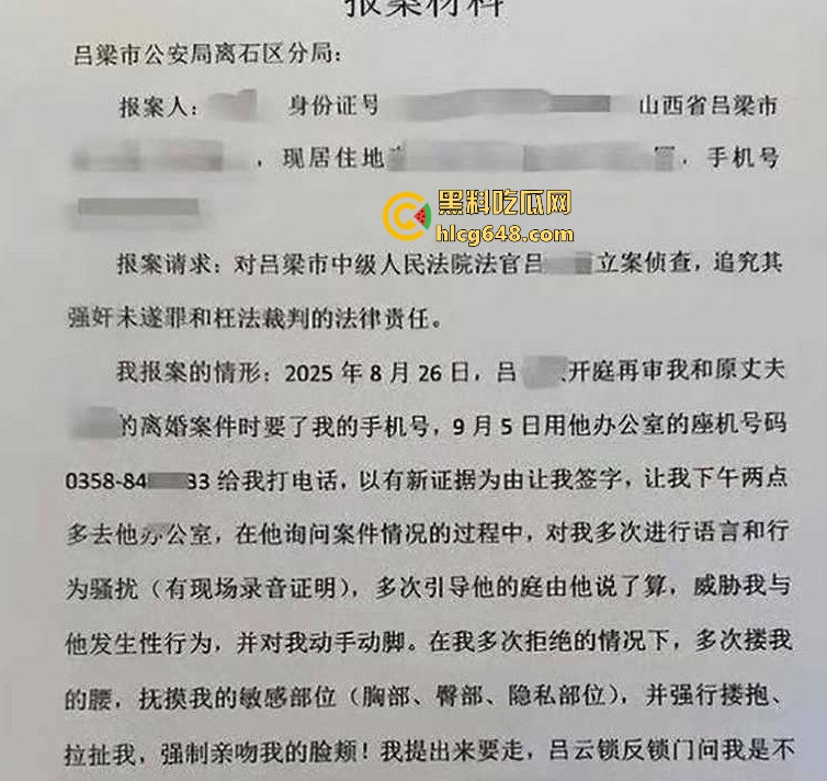 该文章由全网吃瓜发布,转载请注明来源并附上原文链接: 山西吕梁中院法官吕云锁办公室性骚扰离婚案女当事人!反锁房门动手动脚16分钟录音曝光,法院才停职