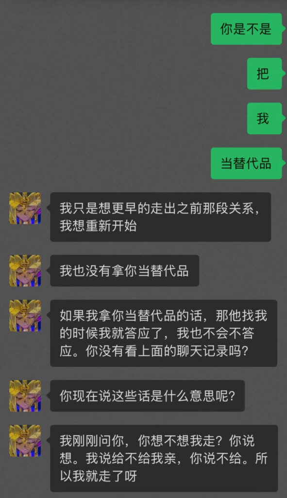 爱玩酒吧 爱装纯情 被发现出轨就说自己不是自愿的 是别的女孩缠着他 美其名曰“我没答应” 真的没有答应吗?