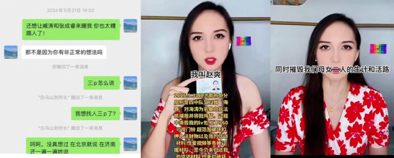 山东济南访民赵爽在公开控告中称,某派出所所长刘海涛在带组值班期间多次擅离职守并与她发生性关系;她还指控刘海涛多次提出与她及其下属辅警进行三人性行为(俗称“3P”)的要求。