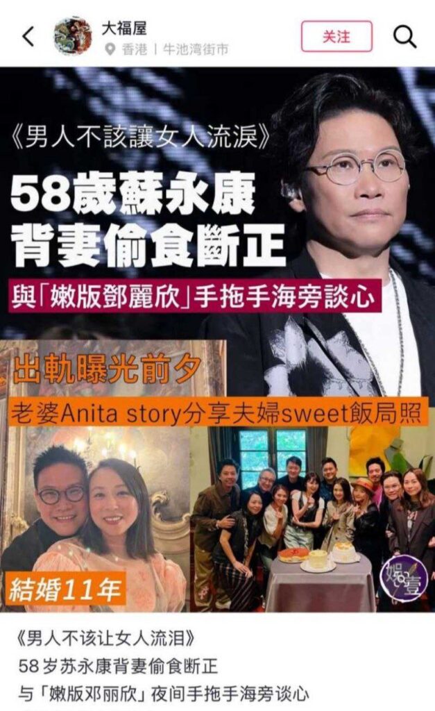 该文章由全网吃瓜发布,转载请注明来源并附上原文链接: 香港情歌王子苏永康婚内出轨陌生女子深情王子太多情