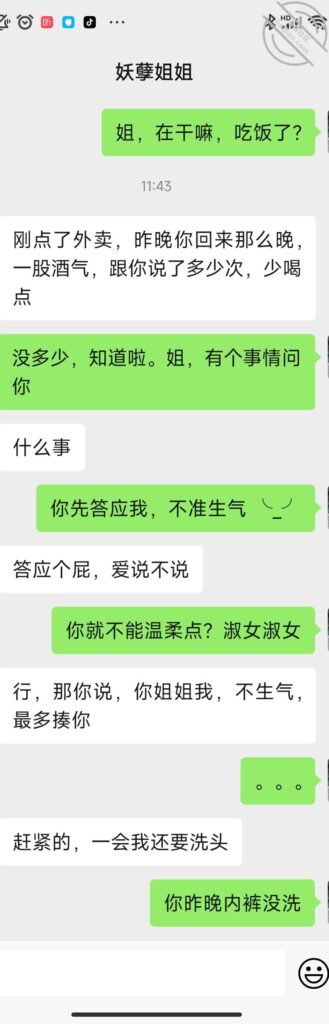 这会我就外卖把酒买了,今晚跟姐姐一起聊聊,看看有没有机会,虽然知道没那么容易,但她这黑丝加内裤我真受不了,昨晚对着她的内裤打了一次飞机,今天早上又一次,这会又想要了,受不了受不了。