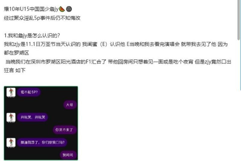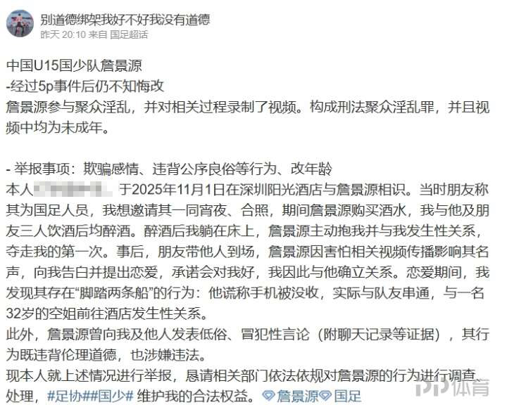 该文章由全网吃瓜发布,转载请注明来源并附上原文链接: 一锤到底国足u15球员詹景源私会32岁空姐出轨多人运动视频流出