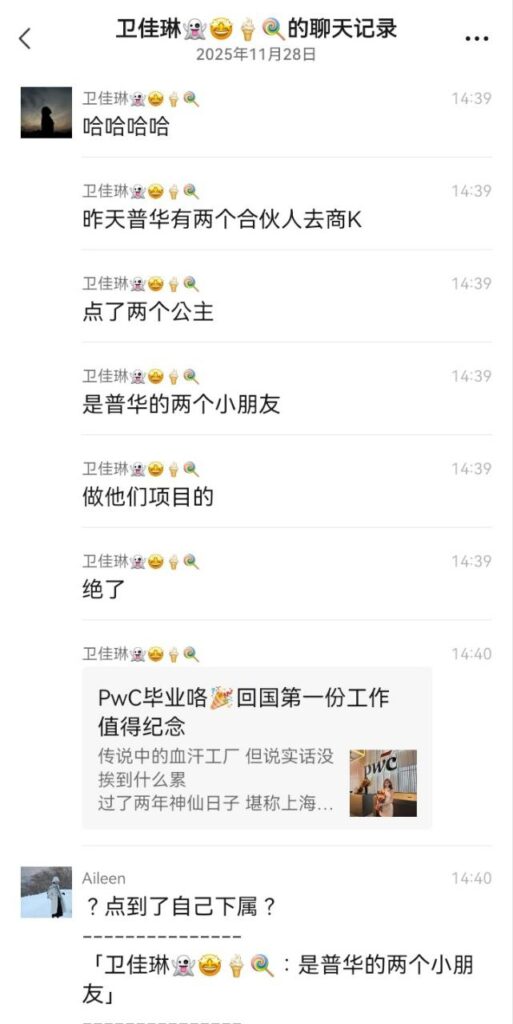 这一波是真的有点出乎预料了,网传普华pwc合伙人相约商k聚会,想不到负责酒局公关的公主小妹,竟是自己的女下属,这是下班了还是没下班?