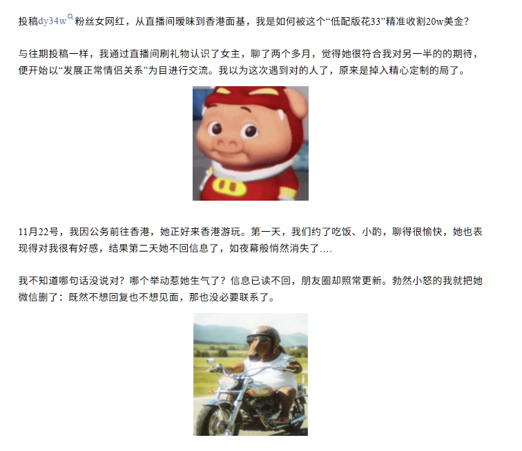 网友曝料,抖音一位拥有34万粉丝的女主播据称上演情感“杀猪盘”翻车记:一名本是直播间送礼的普通粉丝,两个多月私聊后被主播的温柔甜美、颜值和身材迷得晕头转向,最终据称被骗走二十万美元。