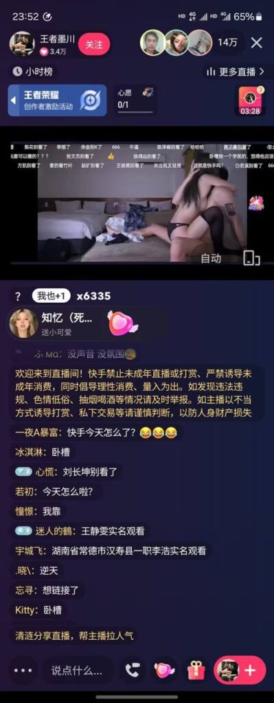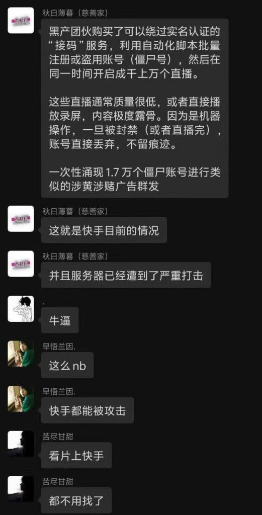造成此事件的原因,来自于某黑客团伙,攻陷了快手注册验证机制,并且使用批量脚本大量注册三无小号,在同一时间开启直播