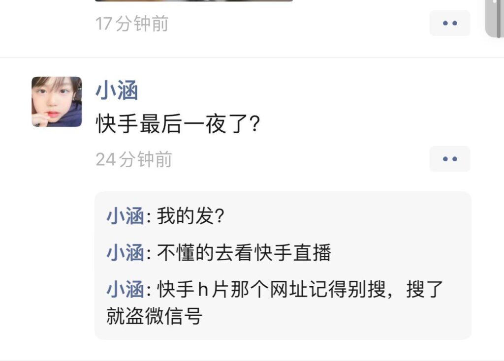 但是话说回来,黑客团伙攻陷快手绝非为了给各位送福利,而是浅浅的藏着巨大的阴谋,在这些三无账号的直播间里,会批量发送各路链接,其中隐藏着恶意木马程序,“不小心”点击的用户,可能会遭遇严重事件