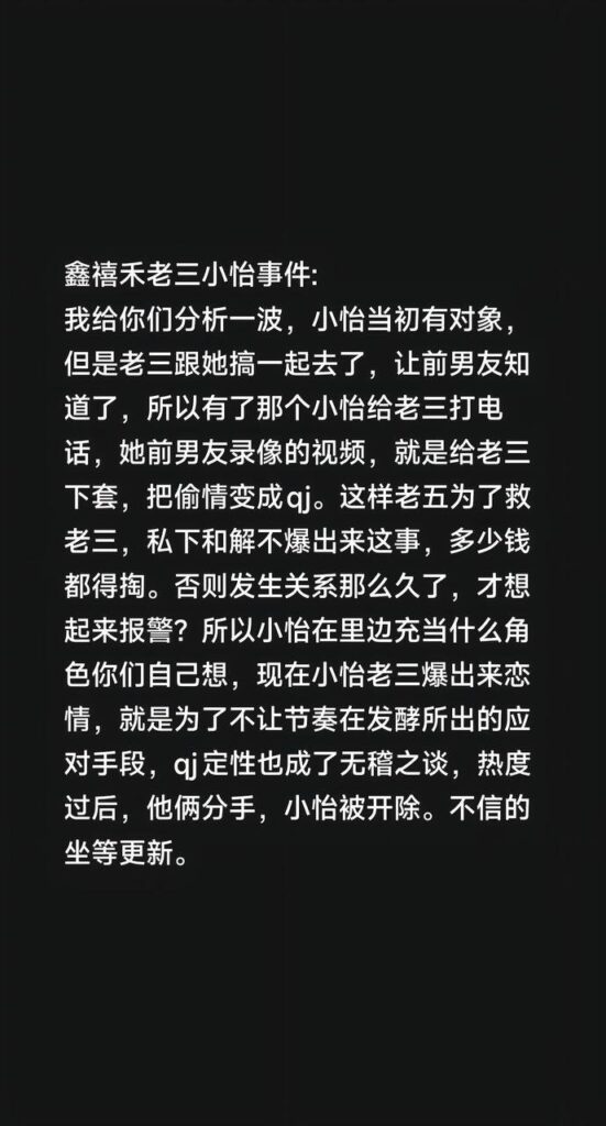 该文章由全网吃瓜发布,转载请注明来源并附上原文链接: 鑫禧禾老三小怡事件大反转俩人单身自愿恋爱前男友嫉妒报复