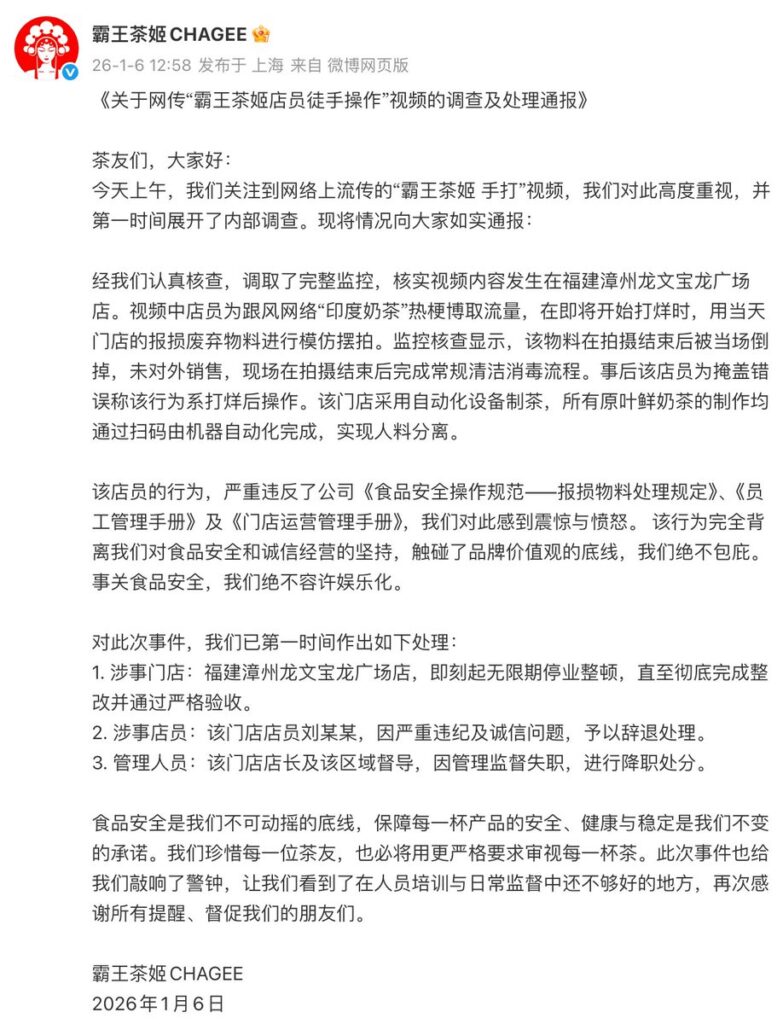 该文章由全网吃瓜发布,转载请注明来源并附上原文链接: 霸王茶姬印度版手打柠檬茶事件员工全菌制作扔茶