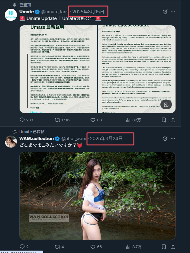 去年3月,umate网站在突发崩溃并发布紧急公告后便杳无音信,导致大量成人内容创作者和订阅用户遭受不同程度的经济损失。