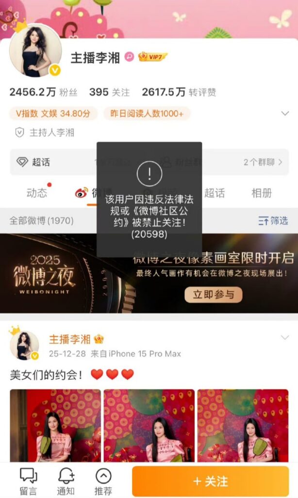 内娱持续震荡,小鲜肉老戏骨纷纷落水,现今就连综艺节目一姐,湖南卫视电视台知名主持人李湘突然爆瓜,就在昨日,李湘的多个社交平台账户,微博、抖音、小红书相继被禁言禁止关注,有传言指出似乎与释永信有关。