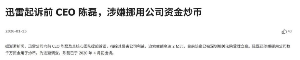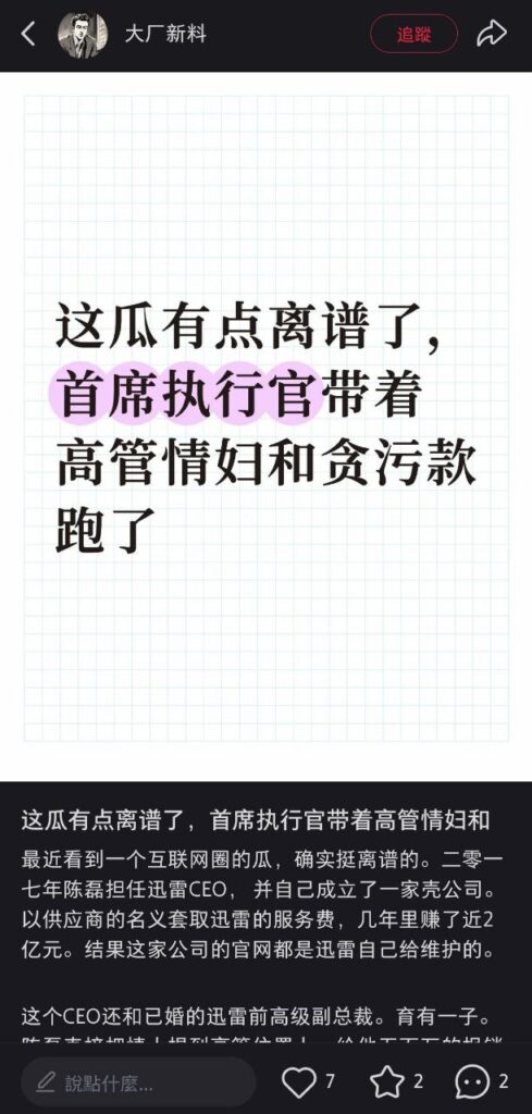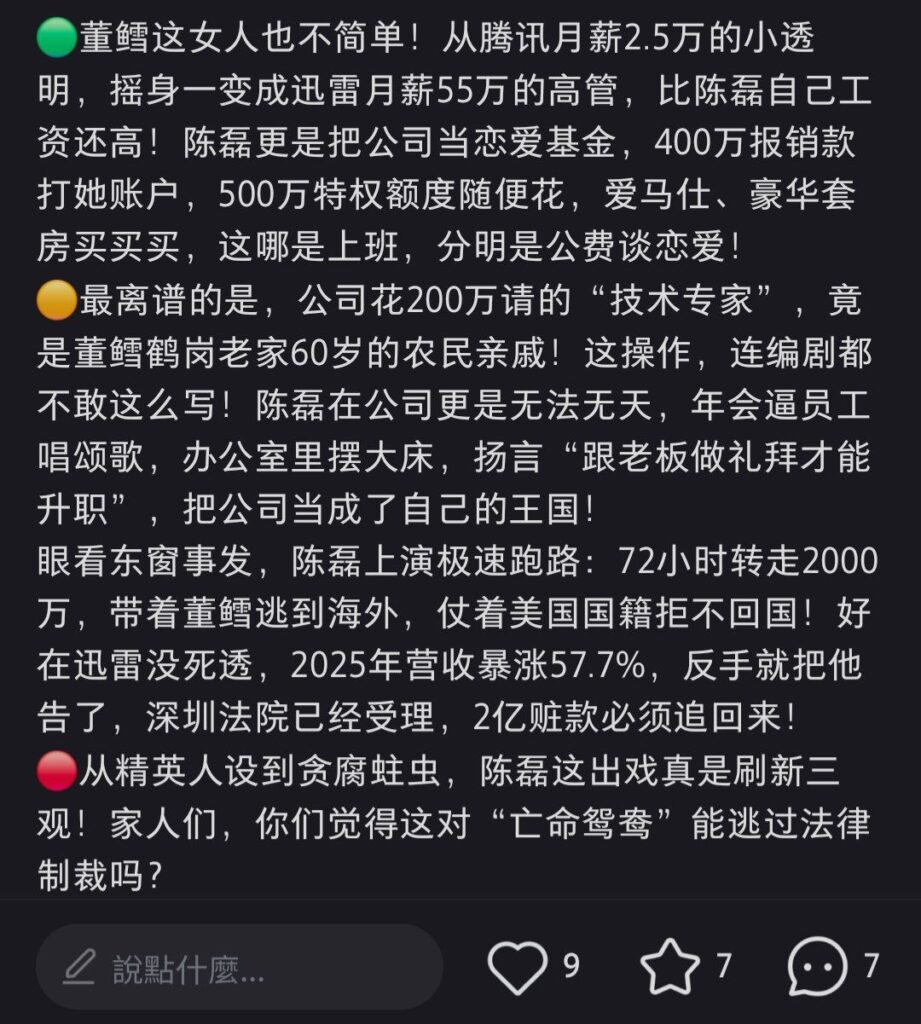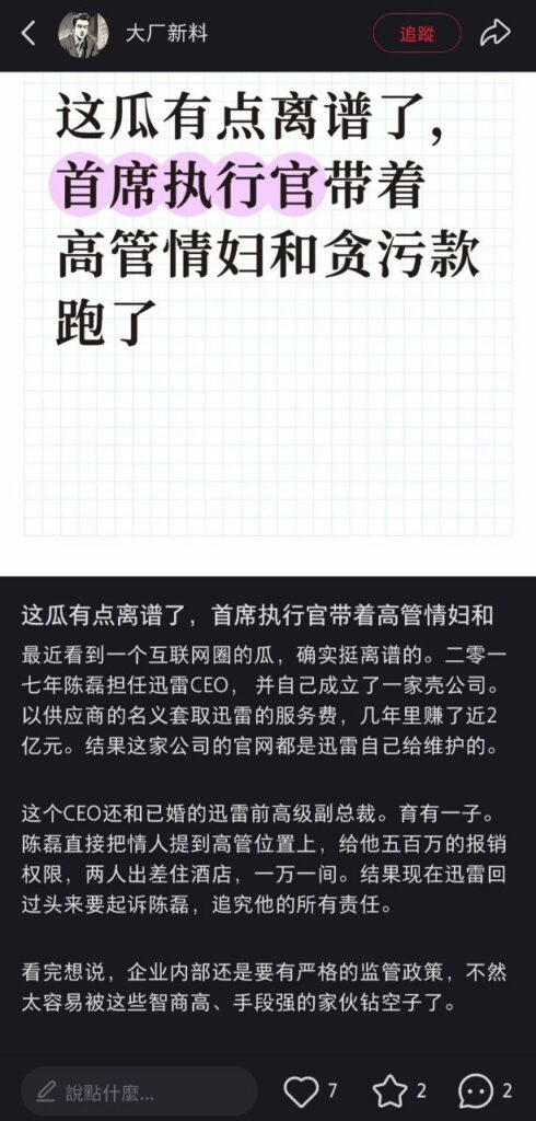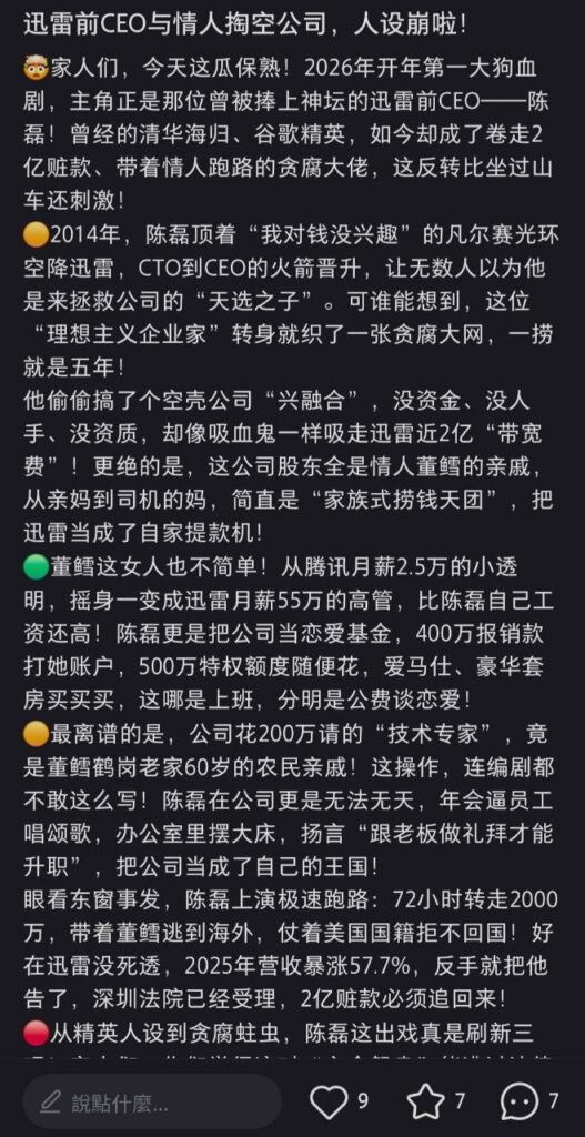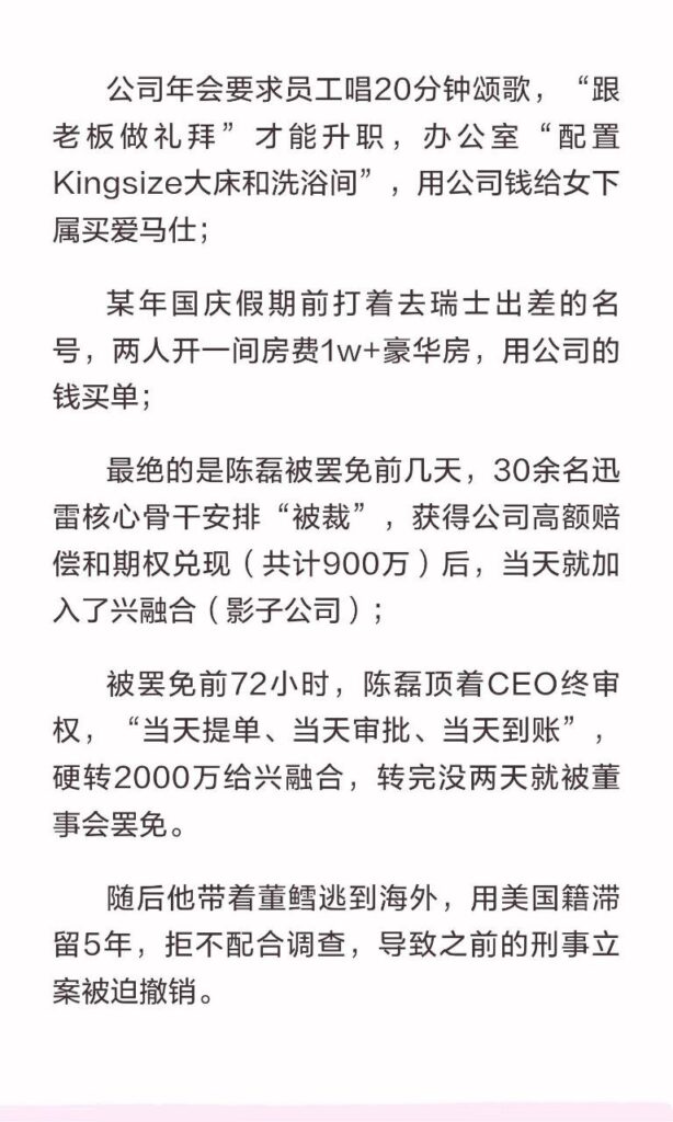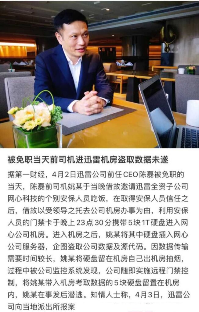 该文章由全网吃瓜发布,转载请注明来源并附上原文链接: 前迅雷ceo陈磊被曝丑闻婚内出轨小三董鳕卷款2亿潜逃