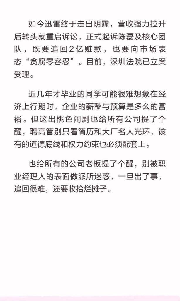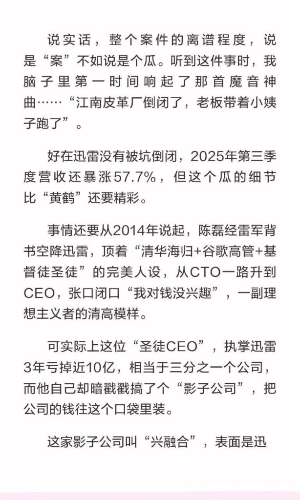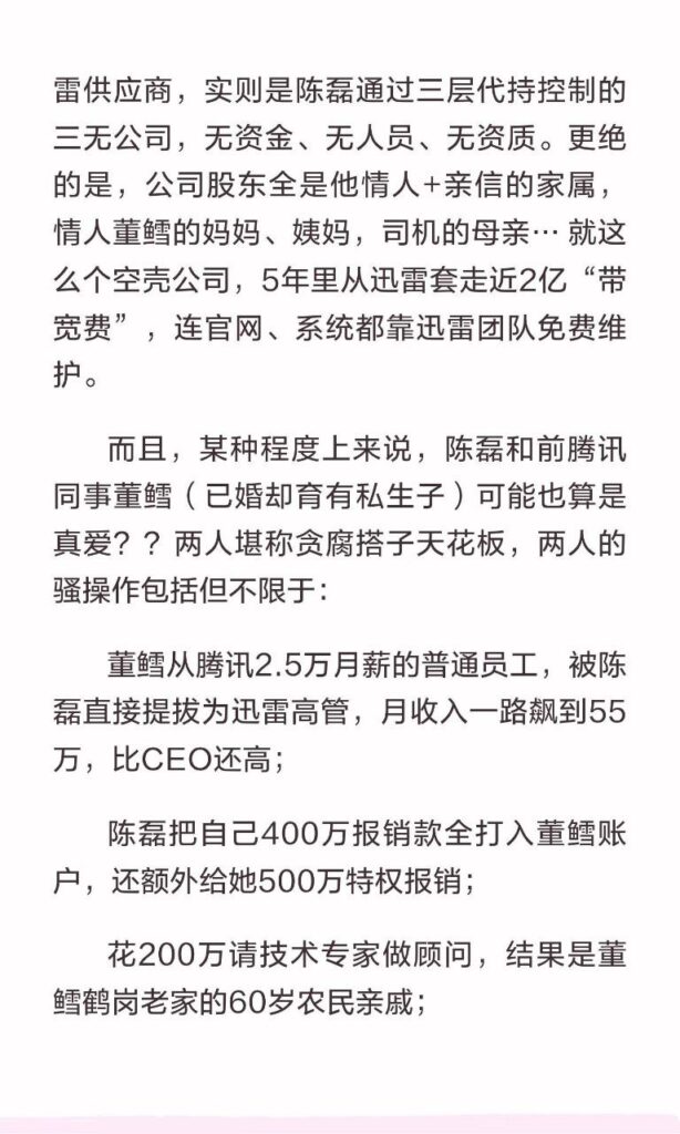 内地科技企业不甘落后,在内娱持续核爆之后,科技圈大佬甩出第一瓜,迅雷前ceo陈磊,被曝出惊天丑闻,婚内出轨下属董鳕,在离职前,从迅雷内部转走2亿现今跑路。