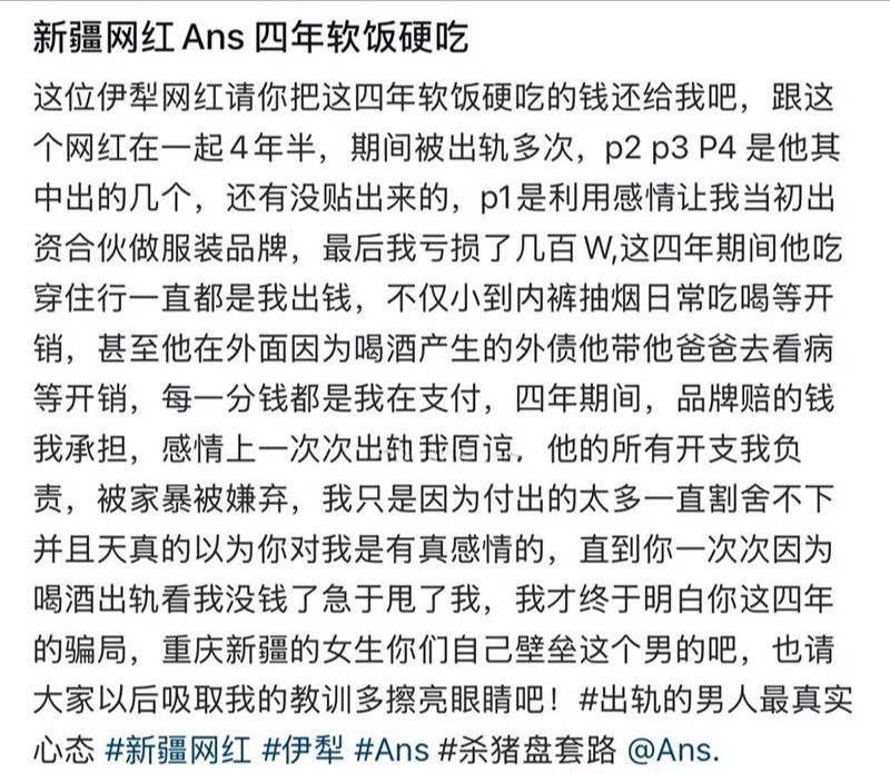 该文章由全网吃瓜发布,转载请注明来源并附上原文链接: 百万冤种姐自曝新疆rapper网红ans软饭硬吃出轨管饭