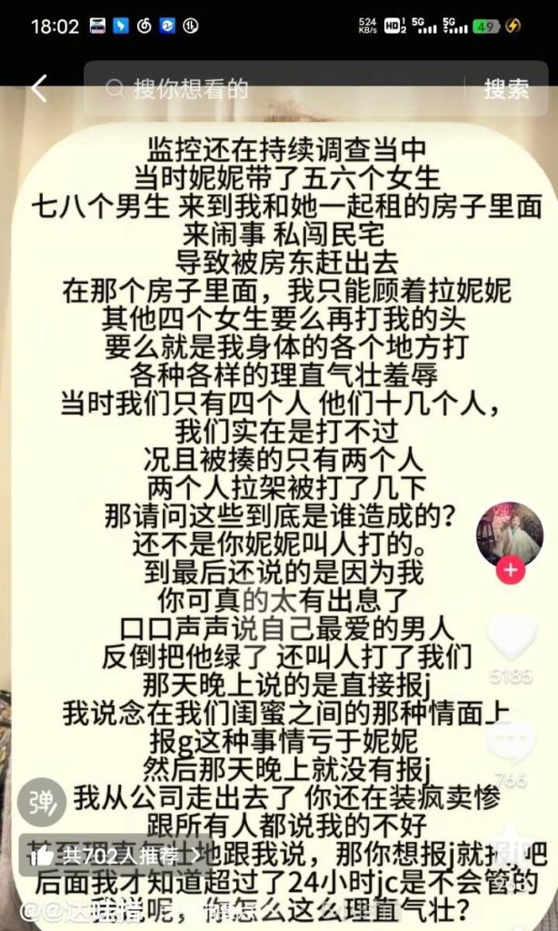 抖音上走红的藏族女团成员妮妮与另一位网红达哇措近日突发公开争执。事件起因于妮妮怀疑达哇措在自己男友耳边说话,进而导致男友提出分手。愤怒之下,妮妮伙同七八人在一处出租屋内对达哇措实施殴打。随后,达哇措在网络上曝光了事情的详细经过。