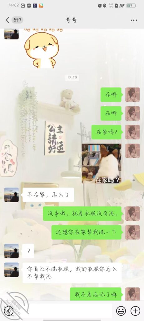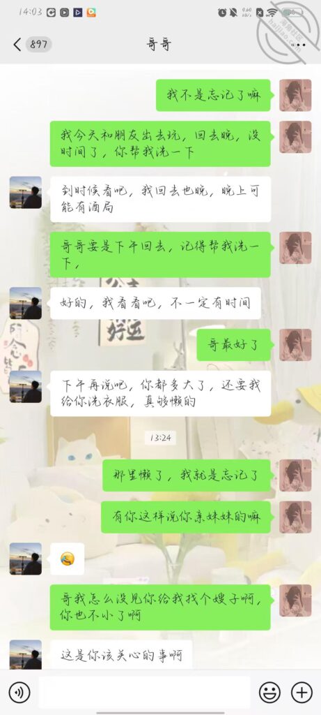 今天我给哥哥发信息,说让他帮我洗衣服,里面还有我的两条带有分泌物内裤,还有匈罩,不知道哥哥看到我的内裤,心里会怎么样,好紧张,又有一点期待被哥哥看到