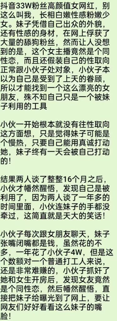 该文章由全网吃瓜发布,转载请注明来源并附上原文链接: 33万粉丝抖音清纯系网红别这么叫我隐瞒性取向捞金被实锤