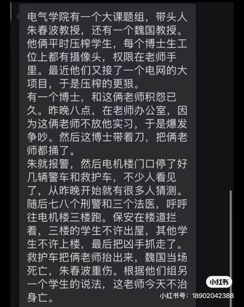 该文章由全网吃瓜发布,转载请注明来源并附上原文链接: 网传哈工大突发恶性暴力事件电气学生持刀捅伤导师