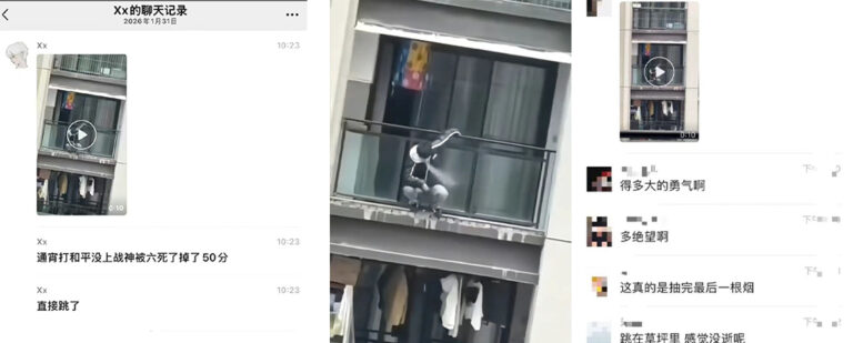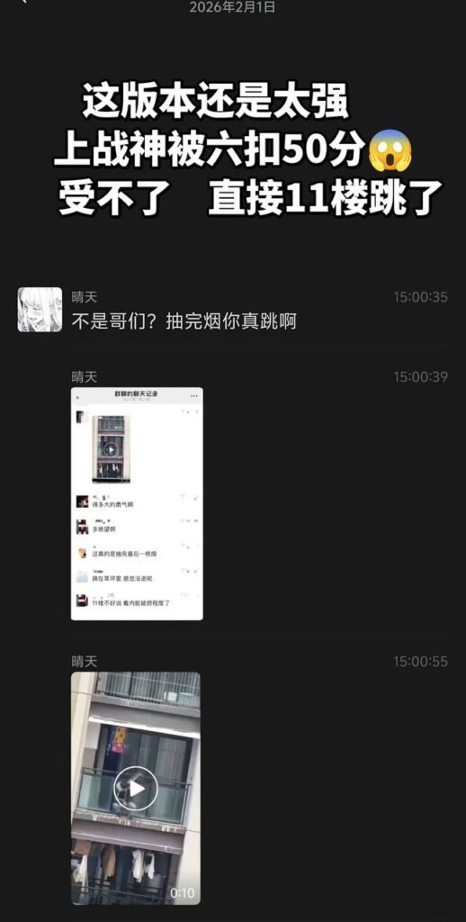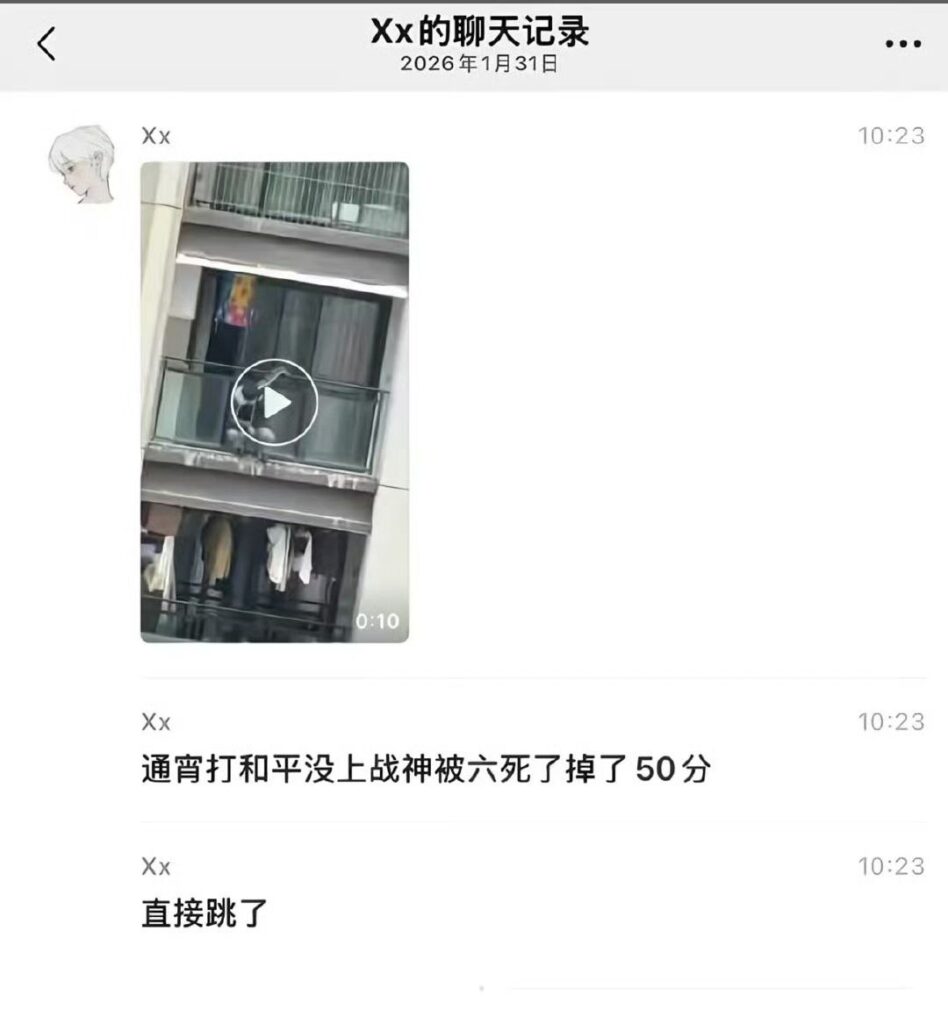 该文章由全网吃瓜发布,转载请注明来源并附上原文链接: 和平精英跳楼事件战神冲段失败被扣50分纵身跳楼