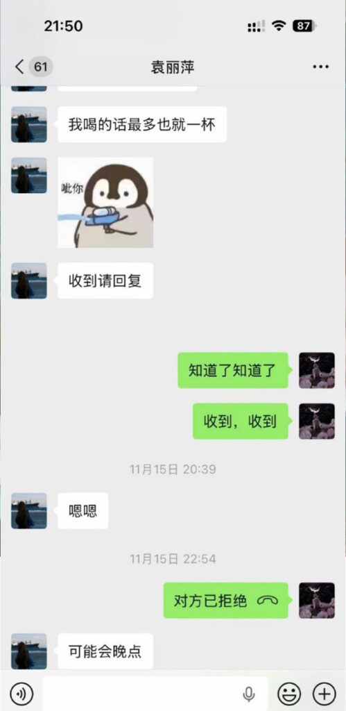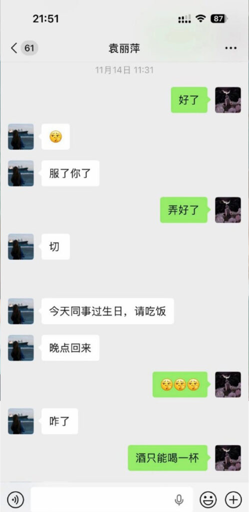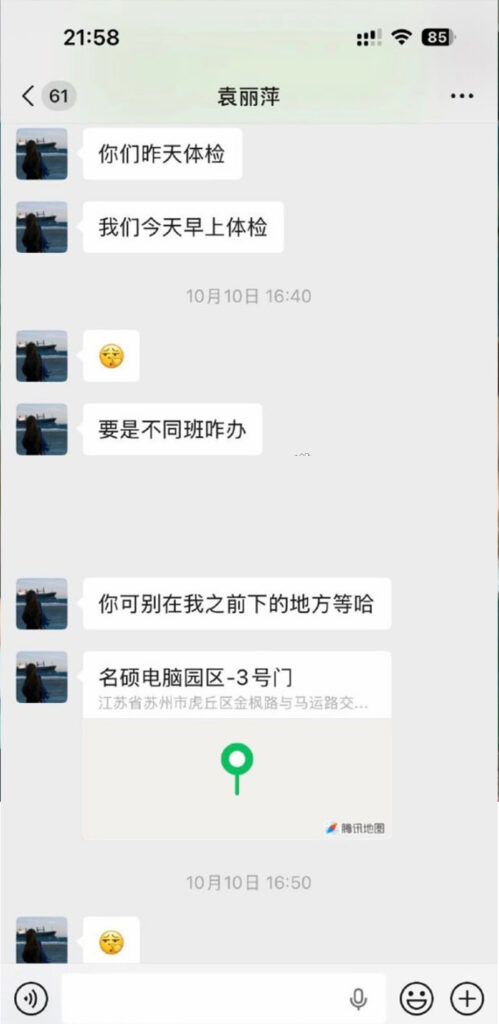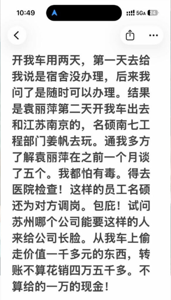 苏州名硕南七工程部员工袁丽萍,男友在社交平台披露称,袁丽萍在工作期间与多名男子交往,数量约为五人;男友因此无法忍受被背叛,选择将相关信息公开。