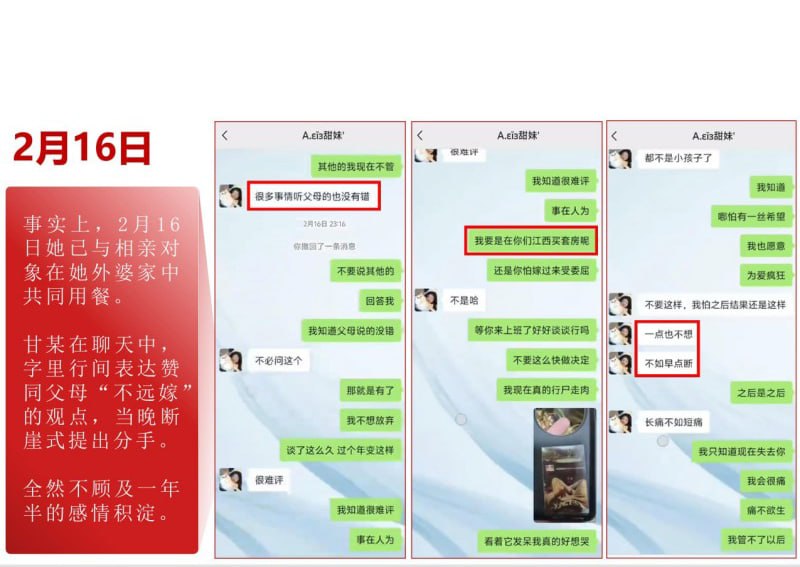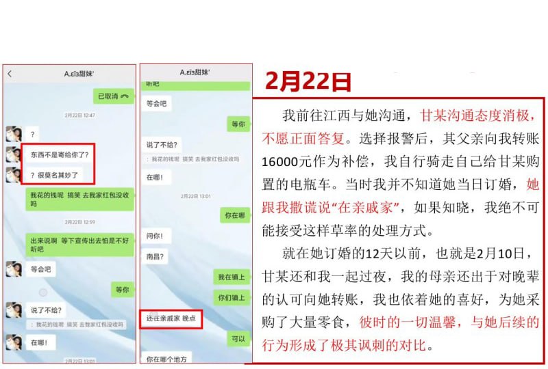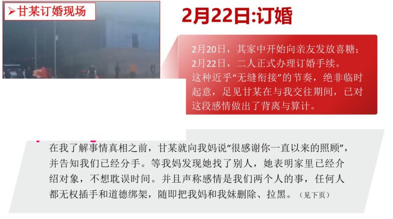 江西宜春再曝情感风波!丰城市淘沙镇一名名叫甘甜的女子,在与男友交往一年零七个月期间,竟同时与一名所谓“富二代”相亲,并在事情发生后迅速与对方订婚。男友得知真相后情绪崩溃,愤而制作了一份长达30页的PPT,将事件经过整理曝光,再次引发网友热议。