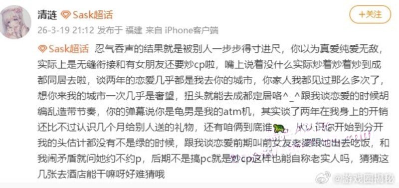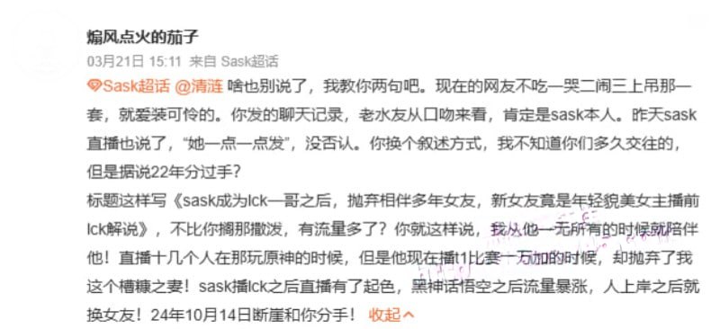 该文章由全网吃瓜发布,转载请注明来源并附上原文链接: LOL职业赛we战队传奇教练sask被前女友实锤渣男出轨嫖娼