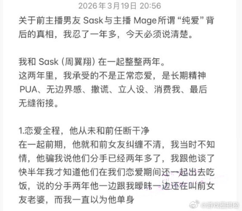LPL圈内近日因前WE战队教练Sask(周翼翔)陷入舆论风暴。其前女友在社交平台发长文并晒出多张聊天截图,直指这位曾被不少粉丝称为“传奇教练”的人物。她开头就痛斥:“Sask,你出轨、嫖娼,还骗了我这么久,该还债了!”据她爆料,两人交往期间,Sask表面维持“专情暖男”形象,私下却多次不忠。她还公开了疑似Sask与多名女性的暧昧聊天记录,其中部分内容甚至涉及“嫖娼”等敏感信息。
