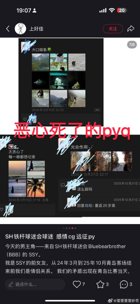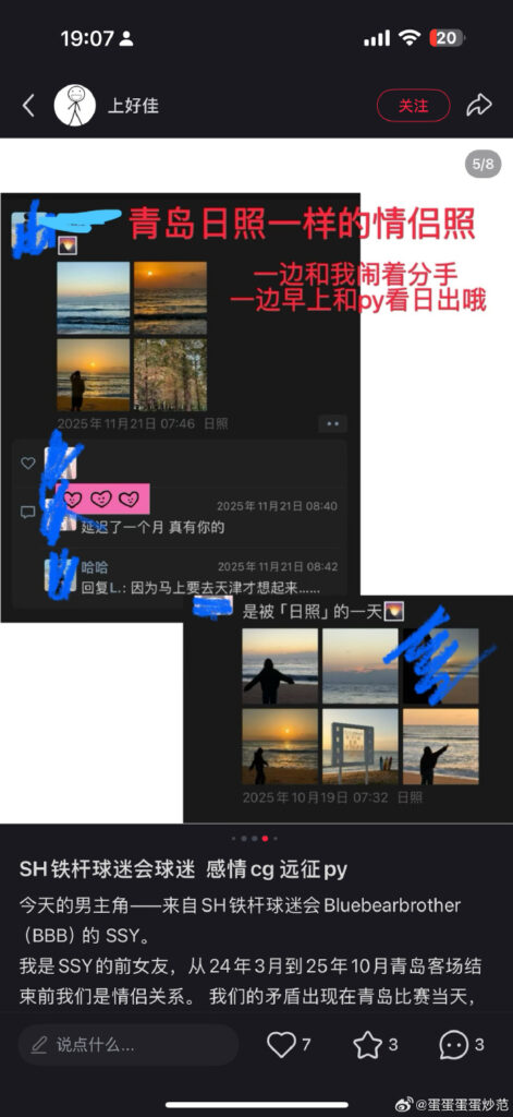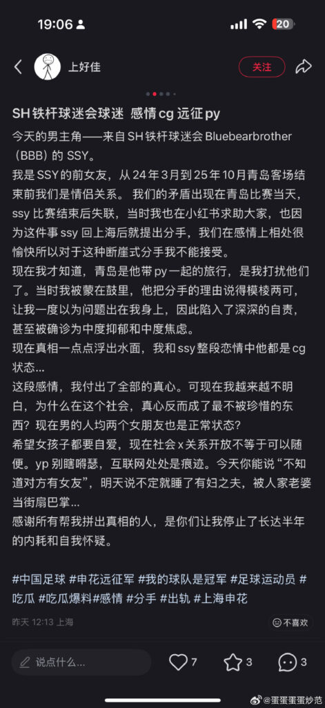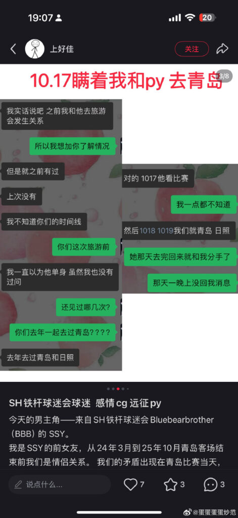 中超圈再度传出史诗级丑闻,上海申花铁杆球迷兼职业赛事裁判ssy被前女友实锤出轨,前女友曝光在ssy在去青岛观看比赛时,竟然是带着炮友一起,本以为自己是正牌女友,没想到和自己交往的整段恋情里,自己才是那个三儿~