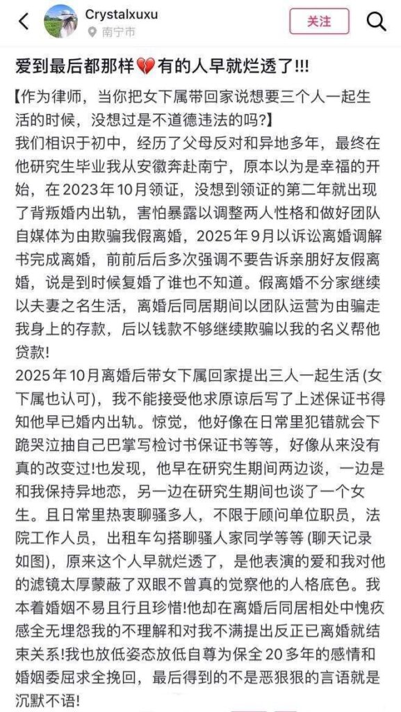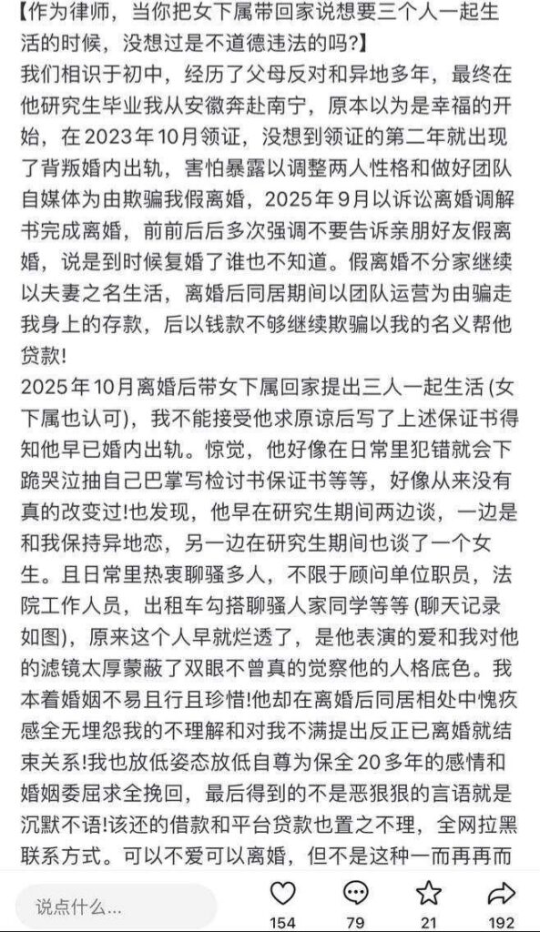 实锤南宁武宣法院律师出轨事件律师婚内出轨女下属脚踏多只船