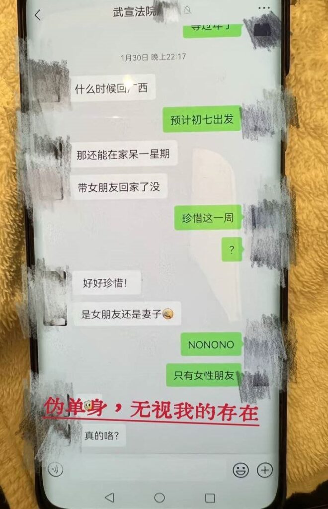 苦主实锤南宁武宣法院公务员律师出轨,指控该公务员长期隐瞒自己已婚事实,与多名女子有婚外情,大量实锤证据被曝光网络。