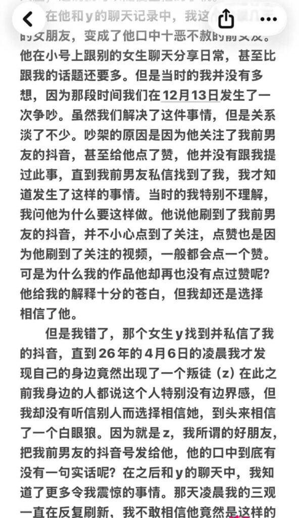 江西景德镇男子张天翼于2025年11月同时交往原女友和抖音上的女生y。11月21日他向原女友表白,翌日又通过小号搭讪y,悄然开始数月秘密约会。真相曝光后,y发现自己被利用,和原女友对质并公开了聊天记录。原来他在两人面前互相贬低:对y谩骂原女友品质低下,对原女友却称y为“小三”,还联合密友z将原女友素颜照和私聊记录发给y,试图彻底抹黑她。愤怒的y不仅白送礼物,支付了游戏皮肤和耳机费用,且他口头承诺还款始终未兑现,最终选择将他拉黑删除好友。