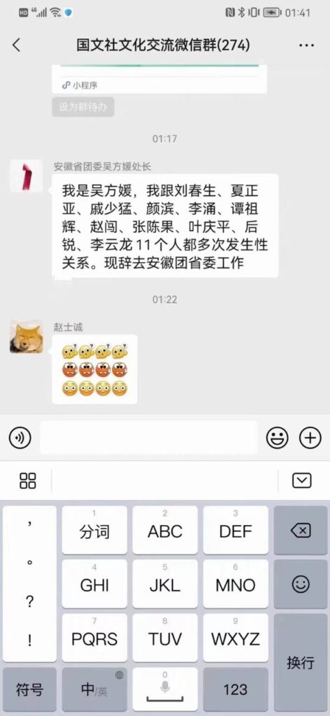 该文章由全网吃瓜发布,转载请注明来源并附上原文链接: 安徽青年企业家协会秘书吴方媛微信群自曝与11人多次发生关系