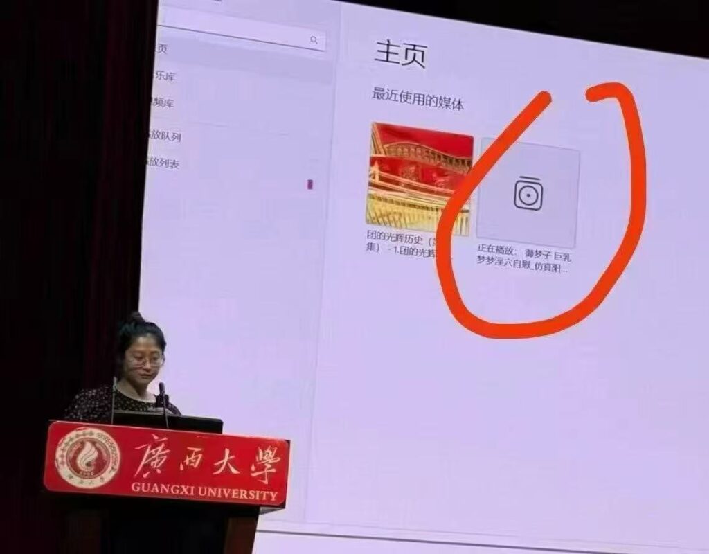 广西大学上演社死名场面,网传广西大学某公开课主持人,在演示课件时,竟意外暴漏曾使用媒体中,赫然有着某暗黑界福利姬作品,场面瞬间被拍照记录,成为赛博记录永生。。。。