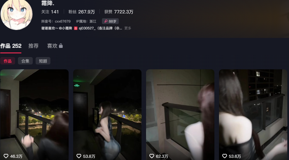 267万粉丝抖音顶级反差网红霜降被传塌房不雅视频外流